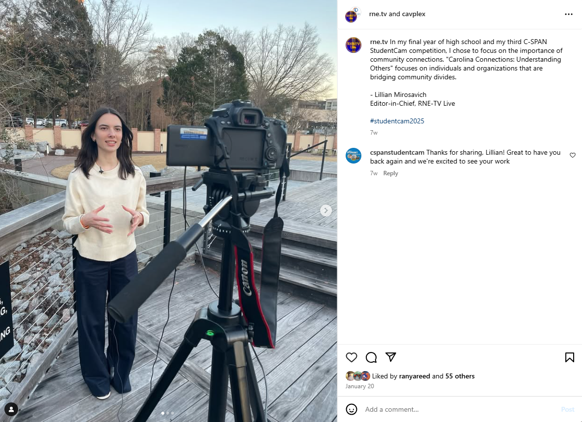 On Instagram, CavPlex is able to connect with other people or groups through hashtags. For the C-SPAN StudentCam Competition, I connected to their Instagram allowing me to enter into the “Behind the Scenes” Photo Sub-Competition, where I was selected as one of the winners.
